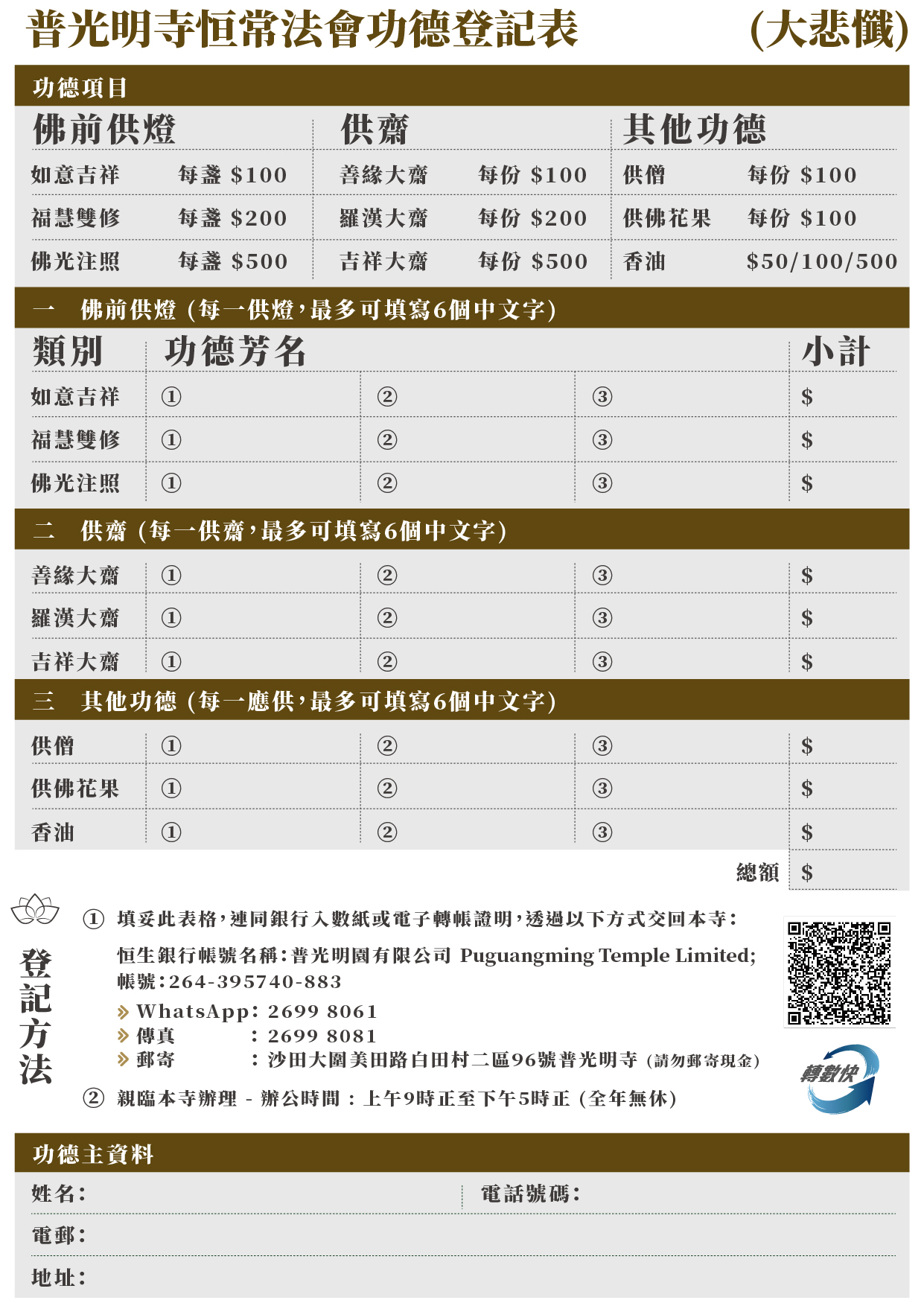 法會當天設有佛前供燈、供僧、供齋等功德,請使⽤「⼤悲懺法會功德登 記表格」,廣種福⽥。