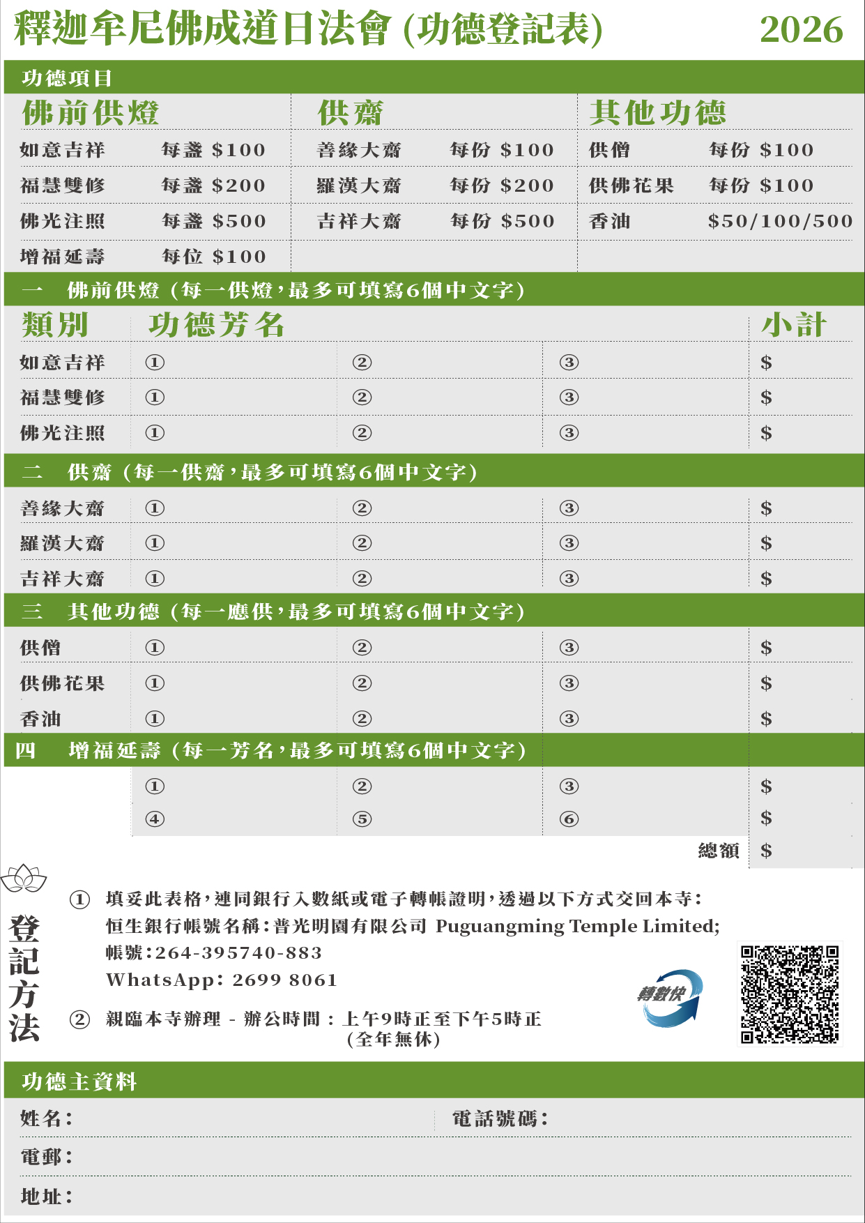 法會當天設有佛前供燈、供僧、供齋等功德,請使⽤「釋迦牟尼成道日法會功德登記表格」,廣種福⽥。