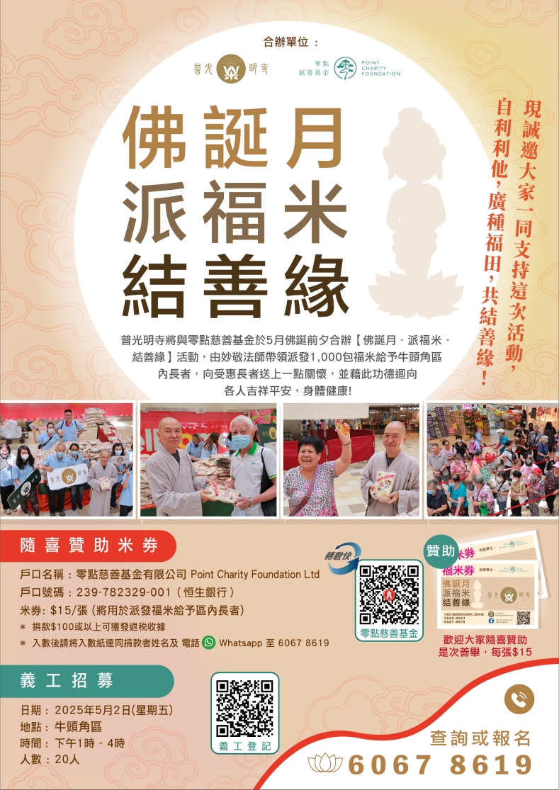 讓義工於參與活動時體驗諸佛菩薩的大悲及大愛精神服務眾生,讓更多世間眾生能從佛法中獲得菩薩昇華,同時更可讓義工發揮菩薩的精神從而化身為菩薩幫助社會上有需要之人仕,共創和諧社會。